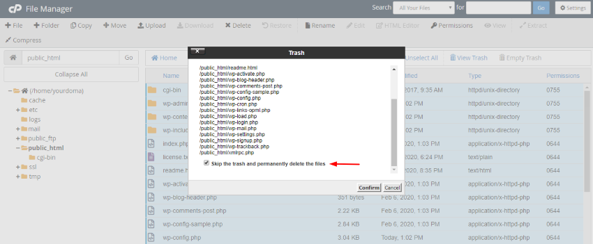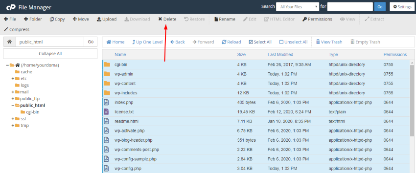 - In the File Manager under Public_html proceed to delete all existing website files.
